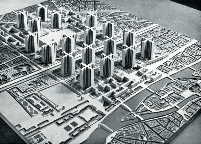 Exemple avec ce projet de Le Corbusier, dont la non réalisation doit vous faire dire qu’un dieu existe (oui, c’est l’île de la Cité, en bas à droite) (note : certains des dessins sont en ce moment visibles au Centre Pompidou) :