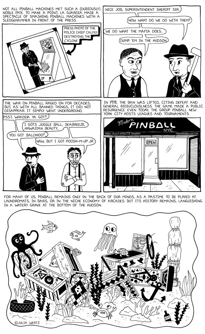 Dernière info que je voulais partager avec vous, mais pas la moindre : Julia Wertz tient également une chronique pour le magazine New Yorker, joliment intitulée The N.Y.C. Mistery Hour, dans laquelle elle revient sur des anecdotes historiques (et souvent peu connues) de sa ville d’adoption. Dernière publication en date : la charmante histoire de la gloire passée des cinémas de Greenpoint (que vous pouvez lire par là). Elle s’est aussi penchée sur les origines de Bottle Beach et Dead Horse Bay (par ici), ou encore le grand mystère du nettoyage des rues new-yorkaises (ici encore). Mais ma préférée jusque là, c’est celle sur la grande prohibition des flippers, dans les années 30 (j’en connais qui auraient bien été attristés, si elle avait perduré) :