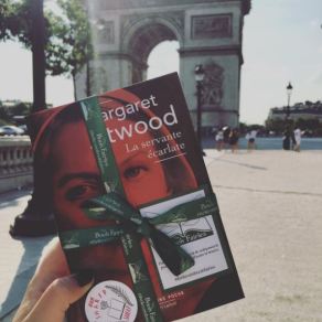 La chasse au trésor s’est ensuite poursuivie tout l’après-midi, avec des bouquins planqués aux alentours de l’Hôtel de Ville, de la Place de la Concorde ou des Champs Elysées. Super chance pour moi qui bosse juste à côté, et qui ai pu m’éclipser du bureau pour aller me balader (sous une chaleur de l’enfer)… et finalement trouver l’un des 100 exemplaires de La Servante écarlate disséminés dans Paris ! (J’avoue tout: j’ai un peu couru comme une golmute quand j’ai aperçu le petit ruban vert sur un banc de la Place de l’Etoile, et j’avais le coeur qui battait comme une gamine de 4 ans qui ouvre un cadeau.)